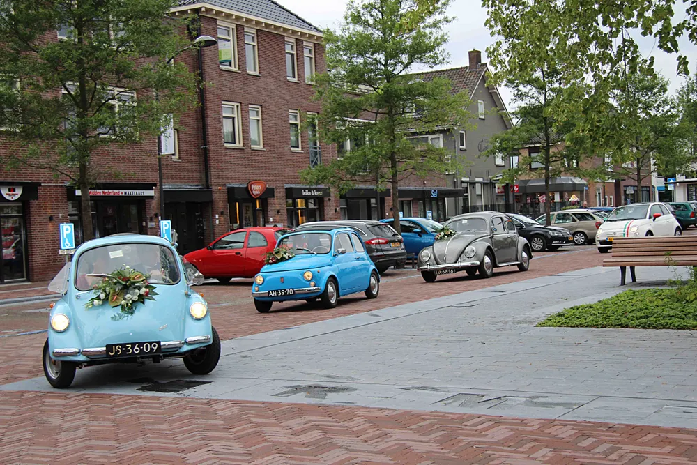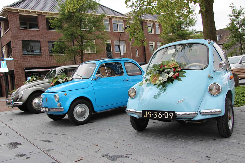 Een lichtblauwe Trojan Heinkel uit 1963, gevolgd door een hemelsblauwe Fiat 500 uit 1965 en een grijze Volkswagen Kever uit 1956. Het was een prachtig 'trouwstoetje' dat vanmorgen, vrijdag 1 juli, arriveerde op het Raadhuisplein.