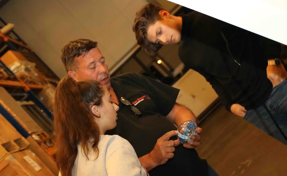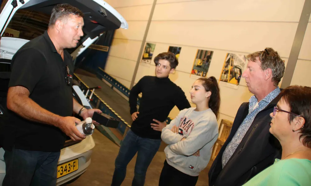 Het geleerde werd vervolgens in de praktijk gebracht in het magazijn van het kantoor waar de rijles auto al klaarstond. Ronald demonstreerde onder meer het olie peilen, zekeringen vervangen tot een band verwisselen. Waarop de leerlingen het zelf mochten proberen.
