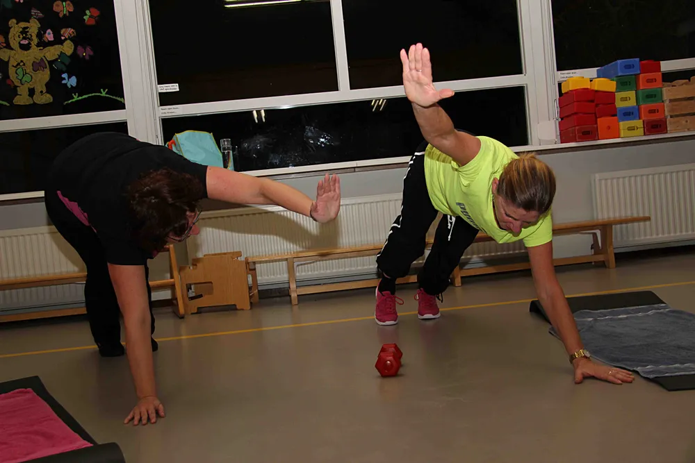 Tijdens het uurtje sporten passeren allerlei oefeningen de revue, begeleid door opzwepende muziek. Van een warming-up, rek-, strek- en conditieoefeningen, zonder en met sportmateriaal als gewichten, hoepels, springtouwen tot ballen. "Blijf lachen en ademhalen", spoort Renate aan. Natuurlijk wordt er ook getraind voor het felbegeerde 'wasbordje'. Renate traint net zo hard mee. "Voelen jullie al wat", informeert ze halverwege, om tenslotte af te tellen: "3-auw-2-auw-en nog eentje. Poeh, poeh," lacht ze haar Be Fit-ters toe, "goed gedaan, want het viel niet mee."
