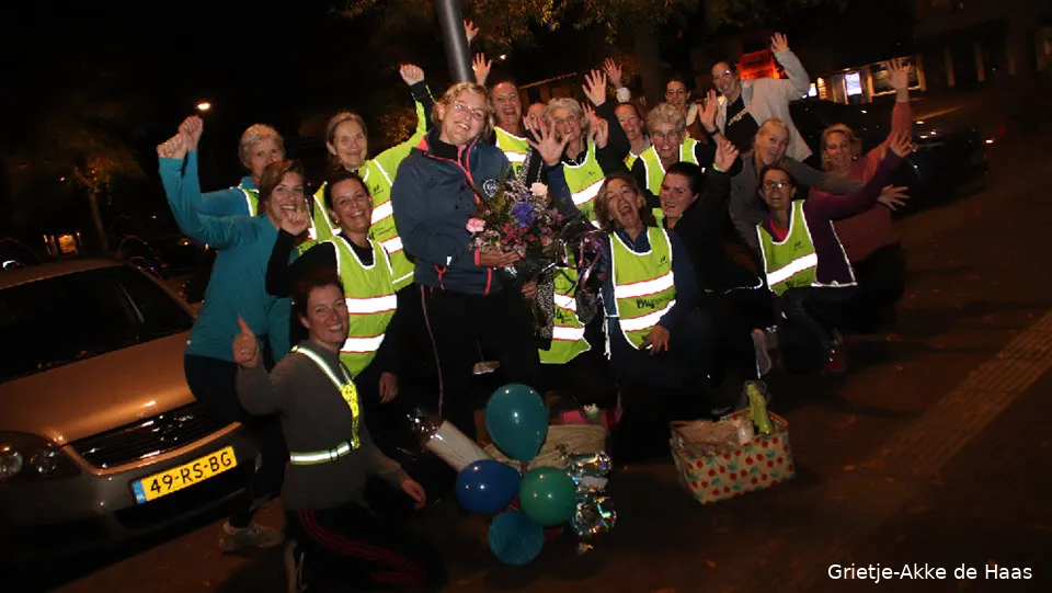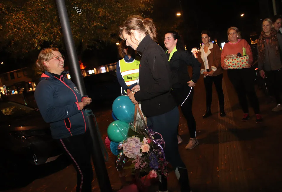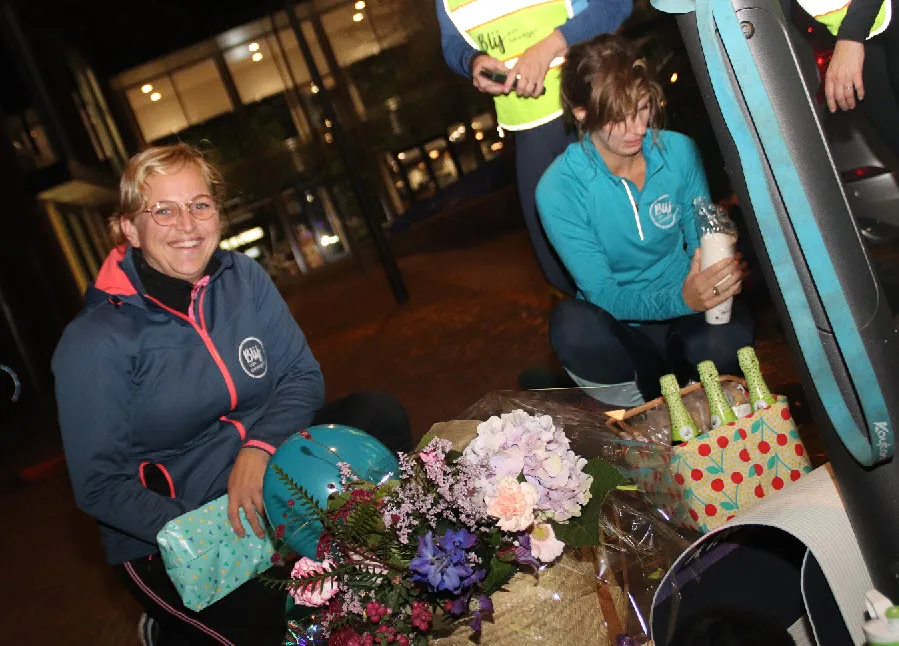 Sportbedrijf Blij van Bewegen, dé vorm van buitensporten in Ermelo, bestaat 5 jaar. De leden besloten initiatiefnemer Jonna Bouwman (40) vanavond, maandag 31 oktober, bij de wisseling van de lessen eens flink te verrassen. En hoe, er werd uitgepakt met ballonnen, bloemen, een yogamatje en telefoonhoesje met het logo 'Blij van Bewegen' erop, een dinerbon, spelletje, kinderchampagne en cupcakes. De leden van wie er veel al 5 jaar sporten bij Blij van Bewegen, zijn namelijk erg blij met Jonna.