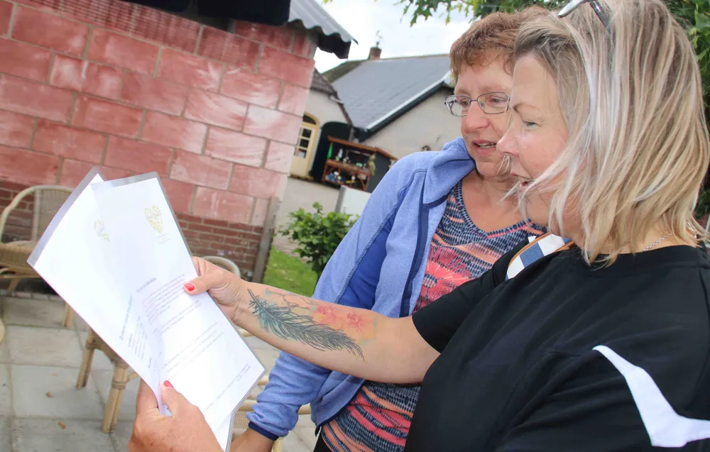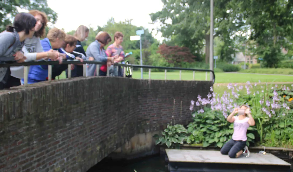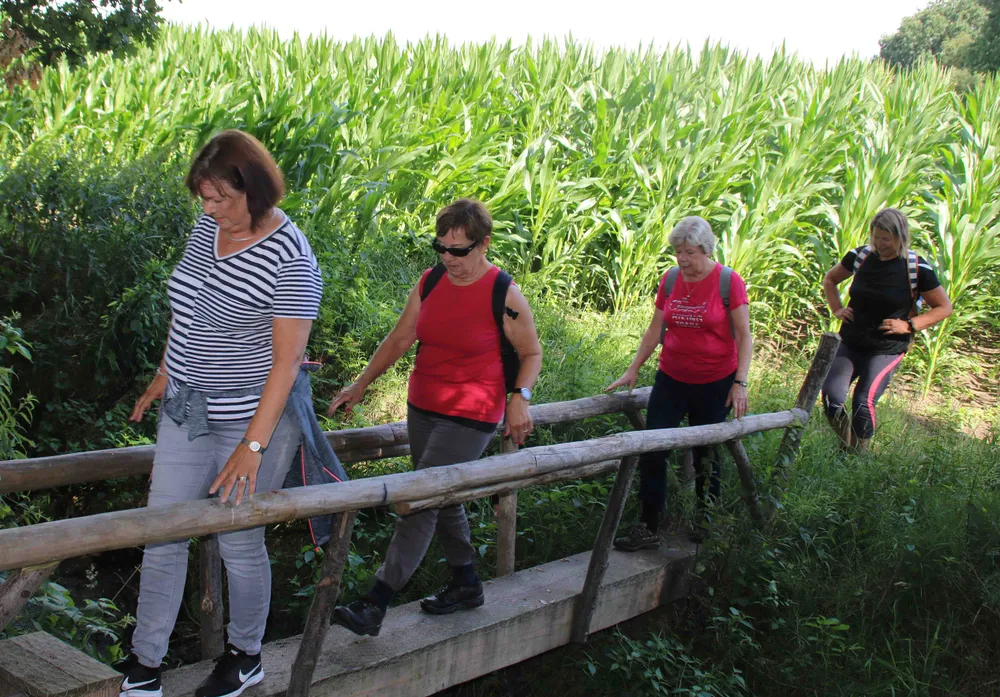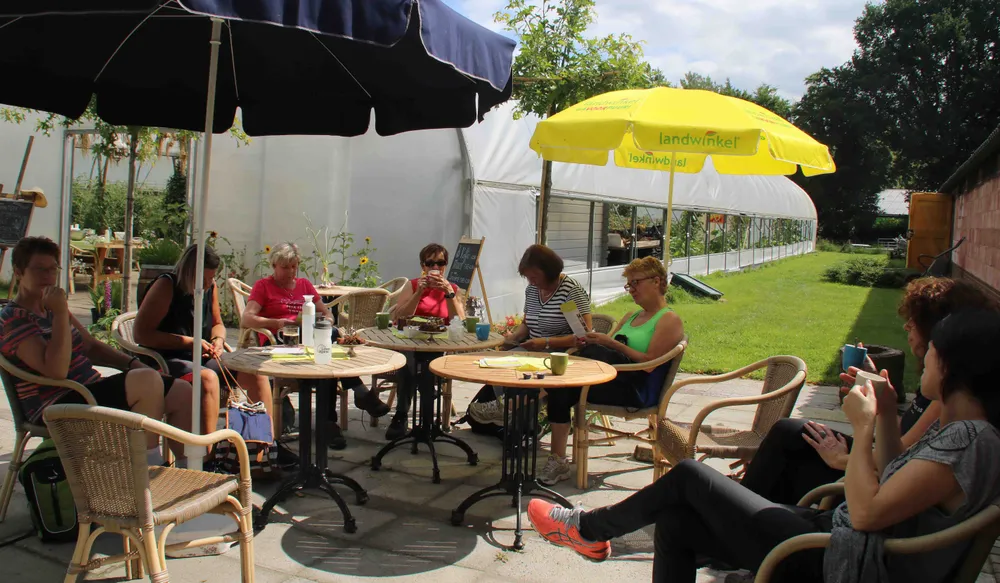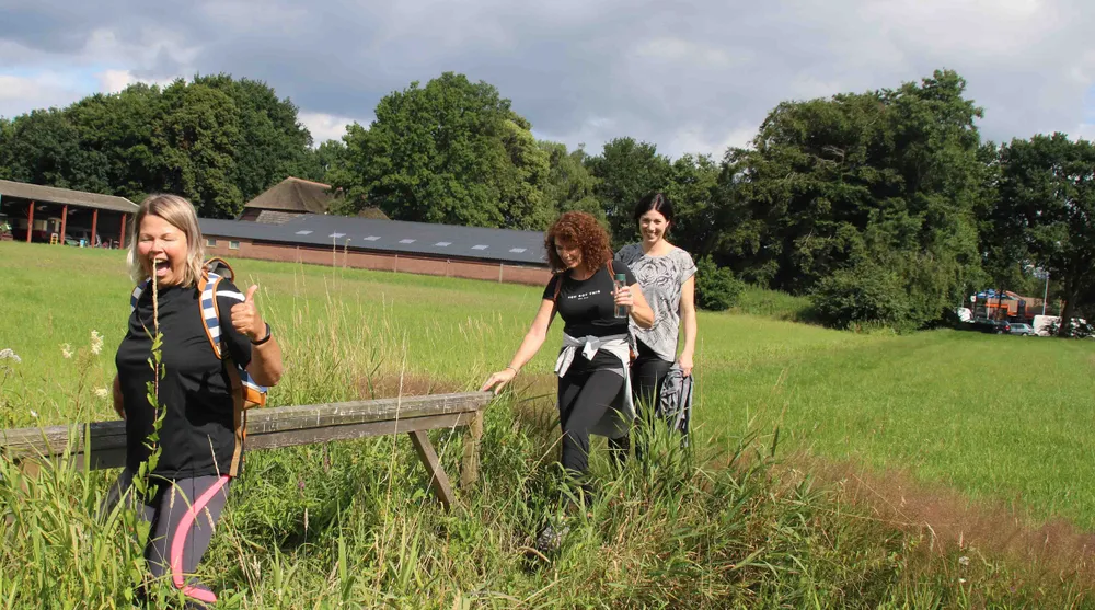 Tegenover de ingang van FC Horst vervolgde het gezelschap het klompenpad door de weilanden, via smalle paadjes met aan weerszijden brandnetels en over bruggetjes, langs Buiten & Binnengoed om uiteindelijk na een wandeling van ongeveer anderhalf uur te arriveren bij Pluktuin Arkeland waar Tineke Offenberg en Krista Boots de dames al opwachten met koffie.
