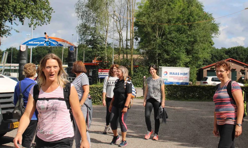 Die kon trouwens na een aantal kilometers stappen over het prachtige terrein van 's Heeren Loo om de middel worden geknoopt. Eenmaal op de Buitenbrinkweg richting voetbalclub FC Horst, waar het gezelschap onderweg bewonderende blikken oogstten van voorbijgangers, brak de zon namelijk pas goed door. Het buitengebied van Horst prikkelde de humor van sommige dames. Terwijl de mestlucht sterker werd lachte een vrouw: "Ik doe mijn jas uit, ruik je het?"