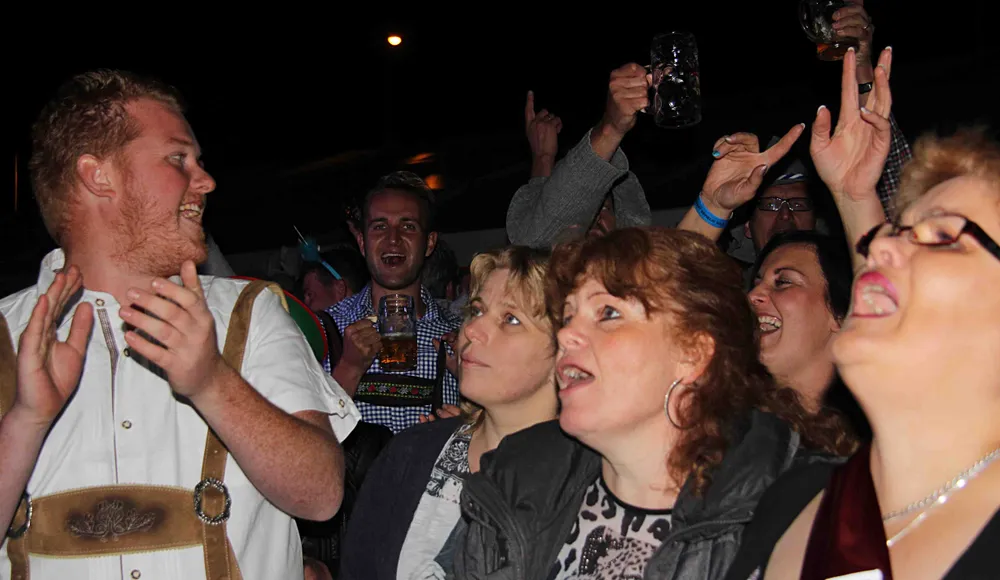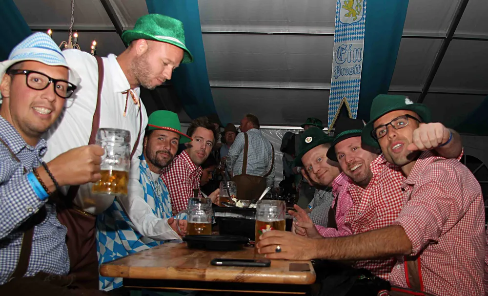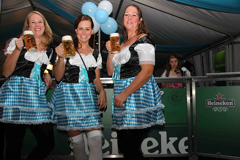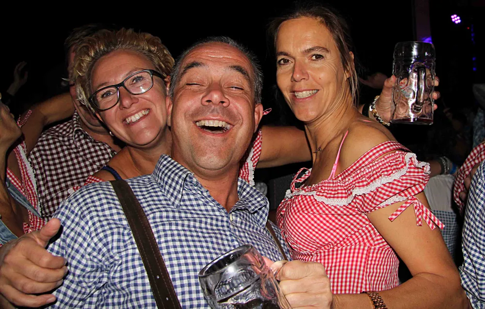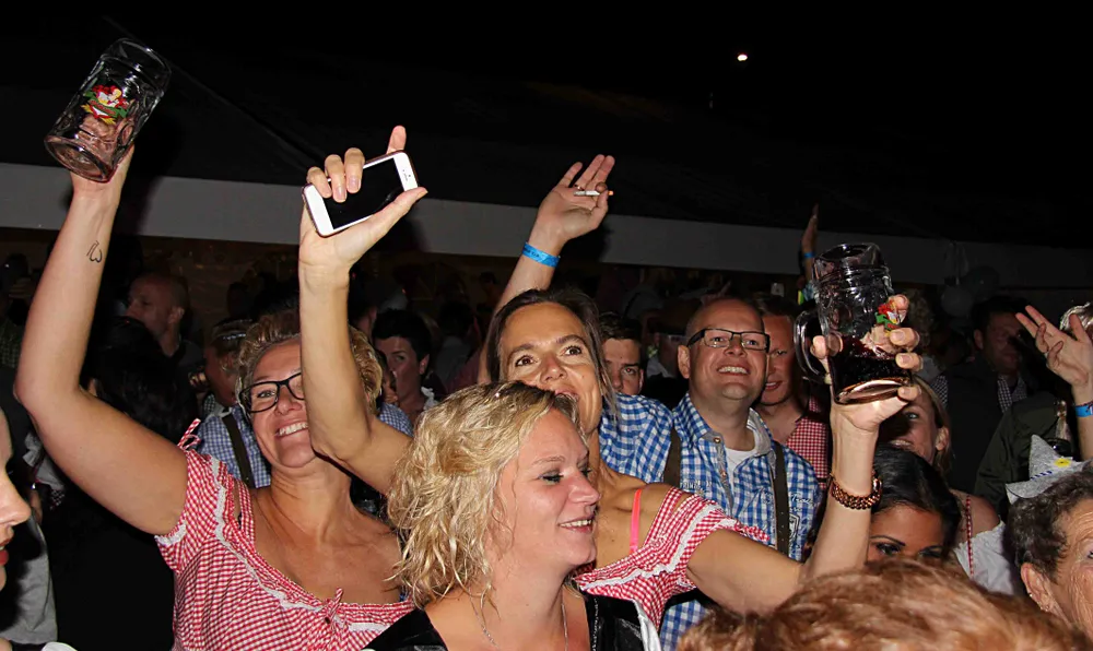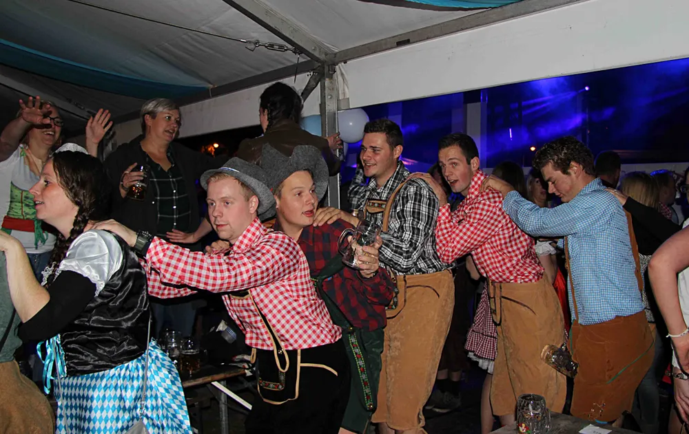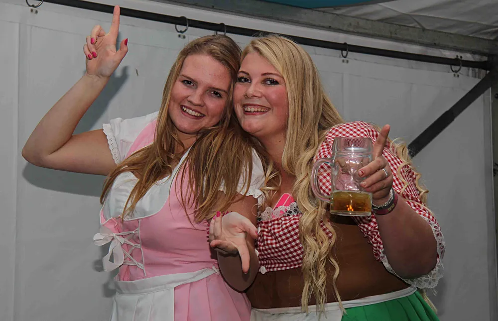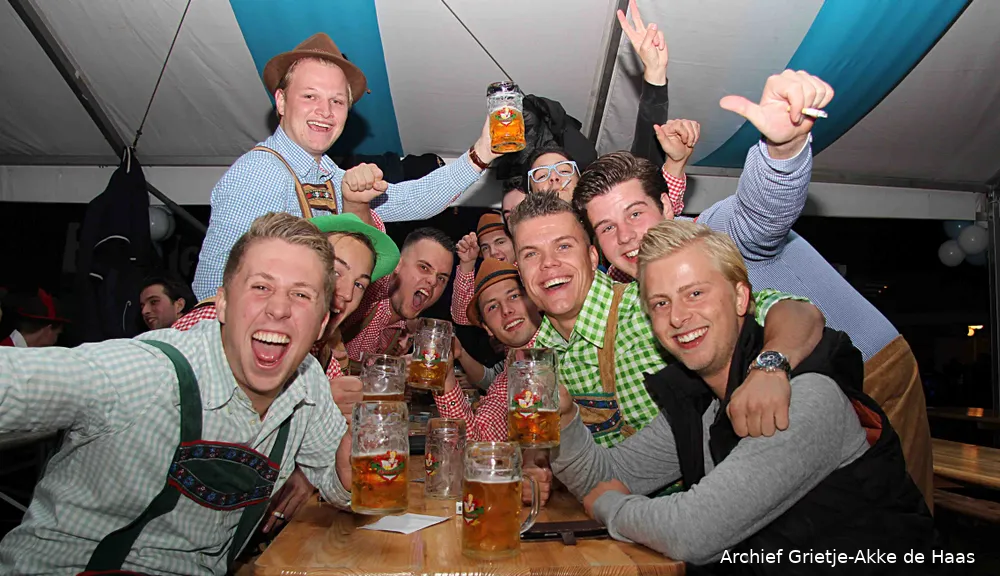 Bijna iedereen van het massaal toegestroomde publiek had zich in lederhosen gehesen of in de zo typerende korte wijduitstaande dirndl jurk, compleet met fraaie kousen tot nét boven de knie. "Wat jammer dat dit pas voor de eerste keer wordt georganiseerd", verbaasde een feestganger zich, "het is zó leuk, ik kom volgend jaar weer." Wat vrijwel iedereen van piepjong tot aardig op leeftijd beaamde. Opperbest vermaakten ze zich aan de tafels waar de pullen bier bijna niet aan te slepen waren, genietend het overvloedige eten.