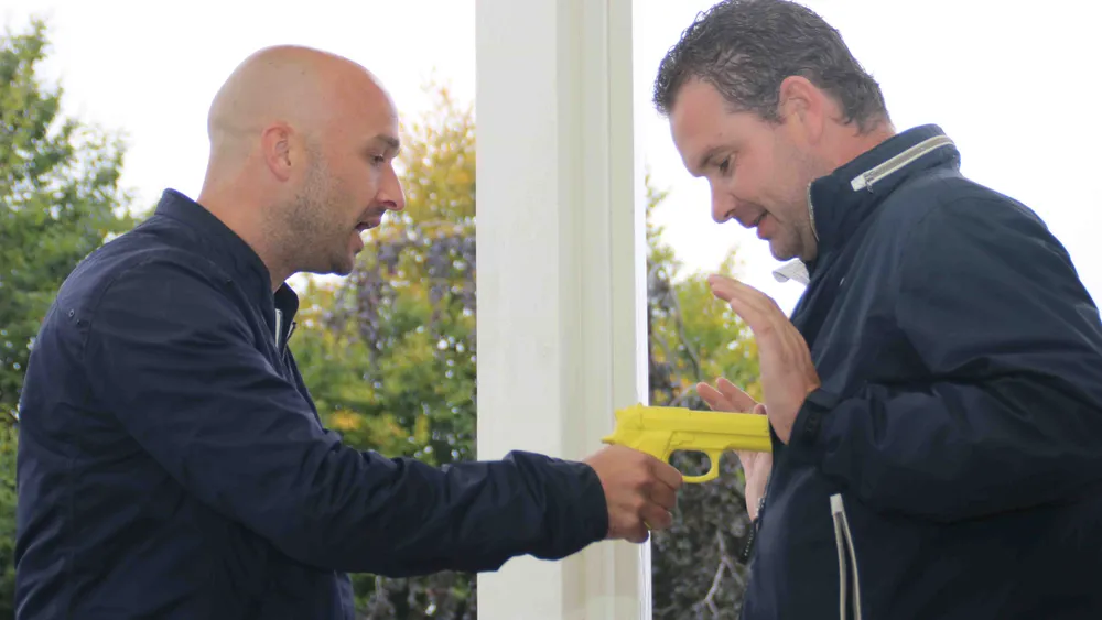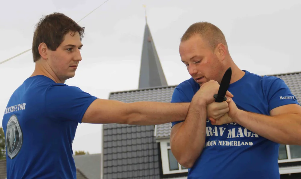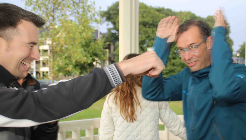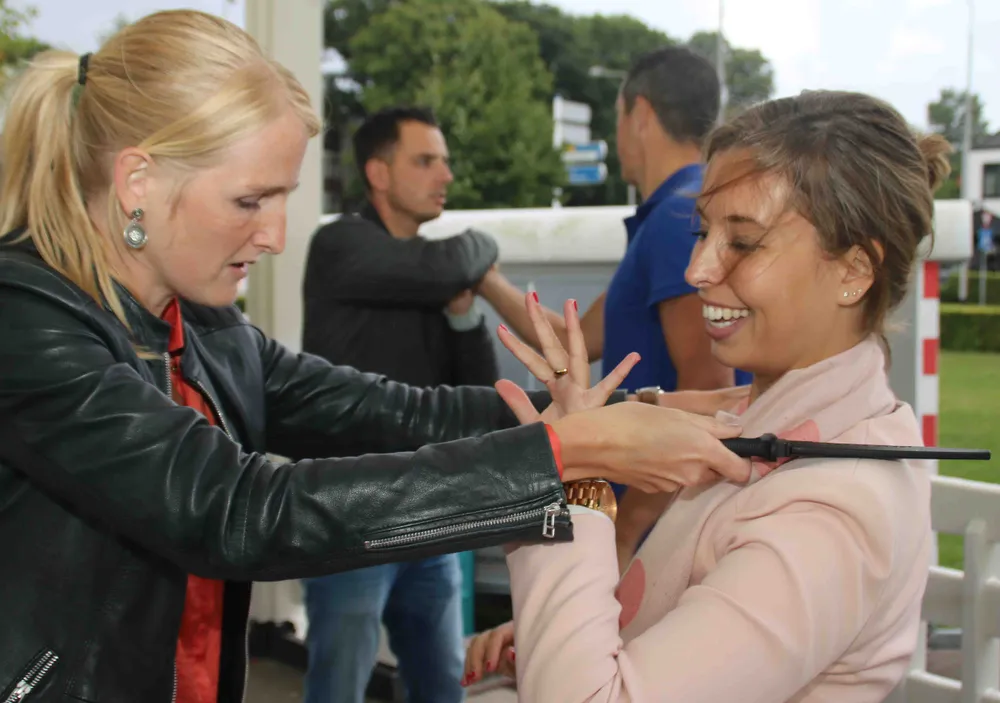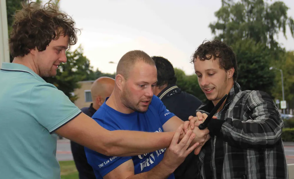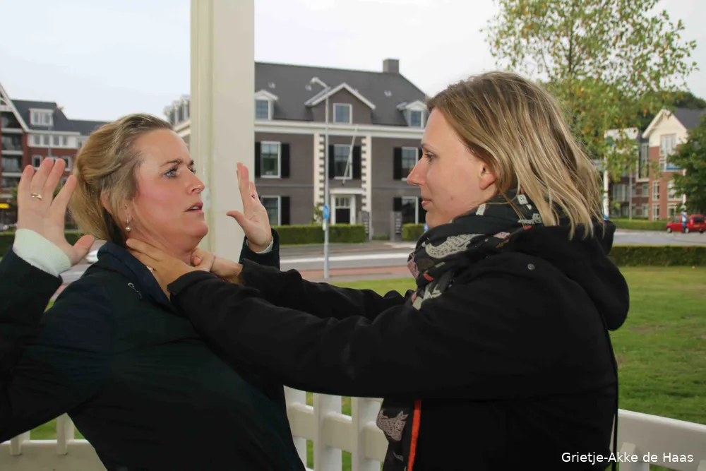 Dat sprak de cursisten zó tot de verbeelding dat ze al hun kwaliteiten van net doen alsof in de strijd gooiden. Met verbeten gezichten, krachtige lichaamstaal én de tips van Martijn en Jeroen oefenden ze manieren van zelfverdediging op elkaar. Maar niet zelden lag iedereen natuurlijk dubbel van het lachen om de eigen capriolen én die van hun 'belager'.