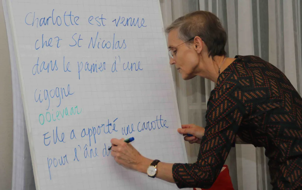 Opnieuw was het bijzonder om te zien hoe snel cursisten in spe de taal oppakken door de lesmethode TPRS waar Alike mee werkt. De methode is namelijk breinvriendelijk en zeer effectief. De taal leren is Alike ervan overtuigd, doe je door te doen met behulp van onder meer gebaren tijdens de lessen, liedjes, gedichten, films, (strip) boeken en bepaalde websites . "Dan pas komt het je hele lijf binnen", weet Alike uit ervaring.