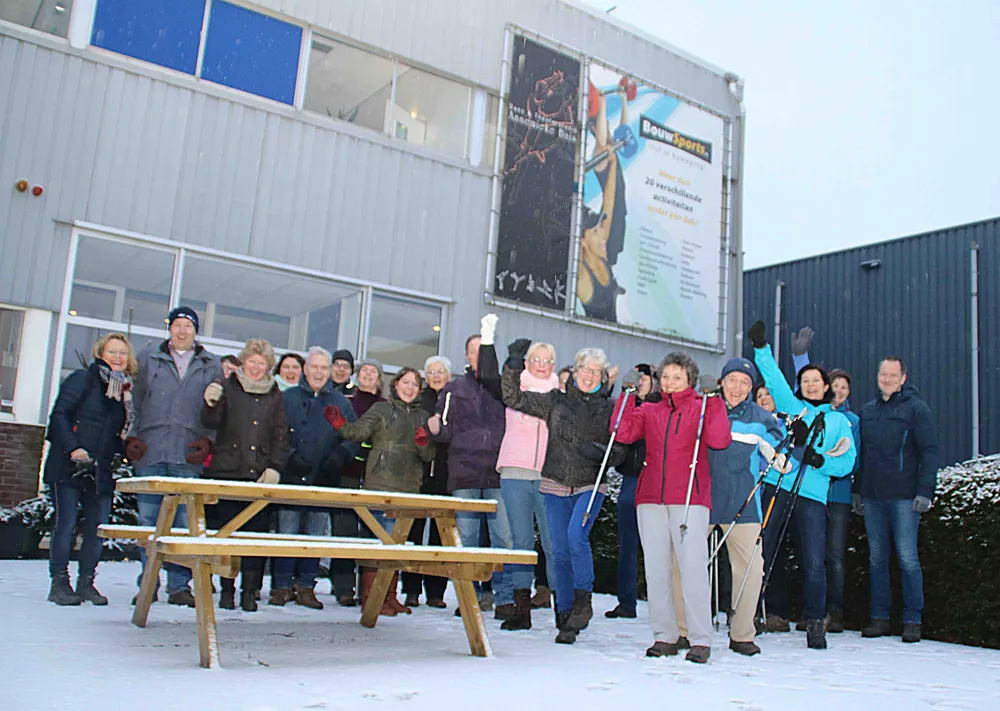 De route die doorgaans een kilometer of 12 is werd vandaag ingekort. Janet Bruining van BouwSports: "We zouden naar de schaapskooi lopen. Vanwege de sneeuw die straks overgaat in ijzel hebben we echter besloten op de hei en in de omgeving te wandelen. Hoe lang we wandelen hangt van de weersomstandigheden af. Want de veiligheid van de deelnemers staat voorop."