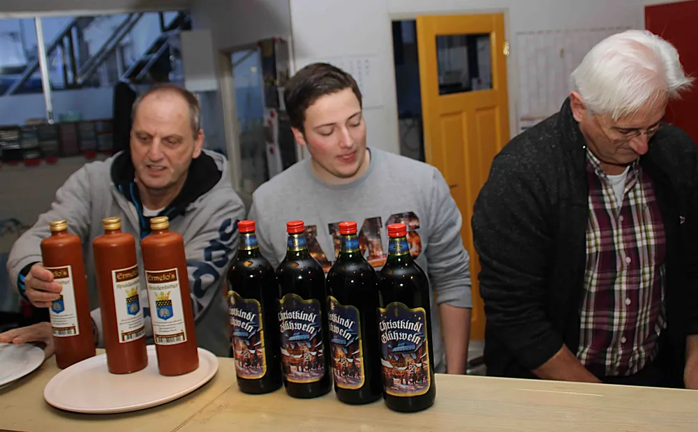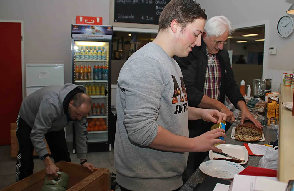 Terwijl het wandelgezelschap door de sneeuw ploegde, diep weggedoken in hun dikke jassen, sjaals en mutsen, togen Wim Bouw, Paul en Gijs Nummerdor bij de sportschool aan de slag met 'kokkerellen'. "We hebben straks wel 28 monden te voeden hè", werd de krentenwegge gesneden en besmeerd met echte boter door Paul en Gijs. Wim rommelde intussen met het gasstel en de pannen zodat de wandelaars op temperatuur konden komen met warme chocolademelk en glühwein.