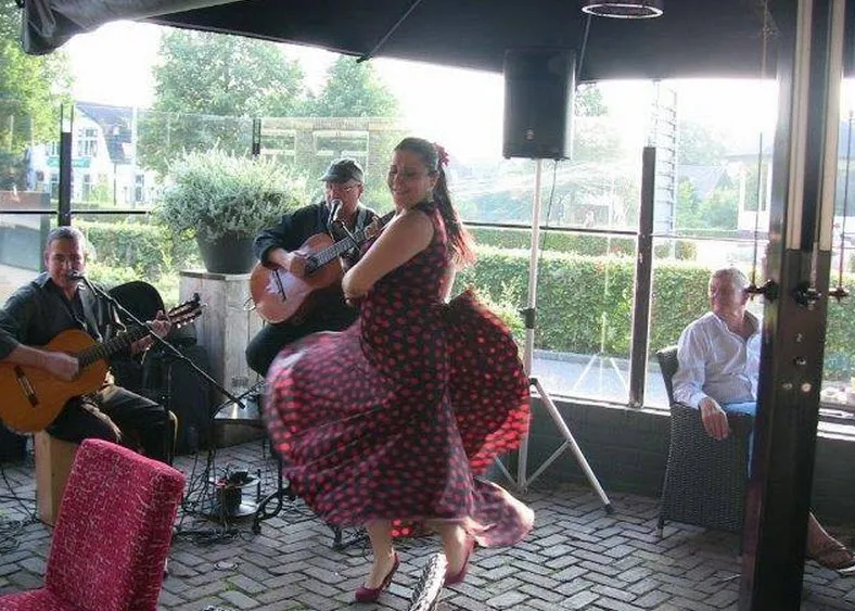 De stemming zit er stevig in rond zeven uur, wanneer een stijlvolle Spaanse Flamengodanseres op de muziek van Carlos Rivas een temperamentvolle dans inzet. Het duurt niet lang of een heer uit het publiek draait aan haar arm mee op de meeslepende muziek. De toeschouwers joelen en klappen en laten zich ondertussen de Sangria heerlijk smaken.