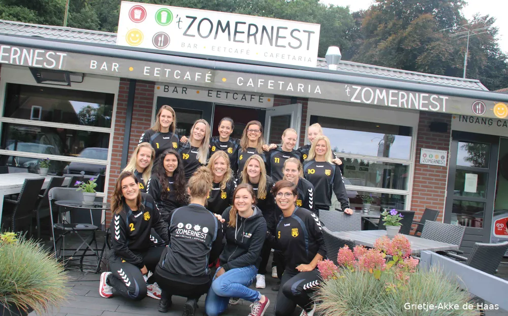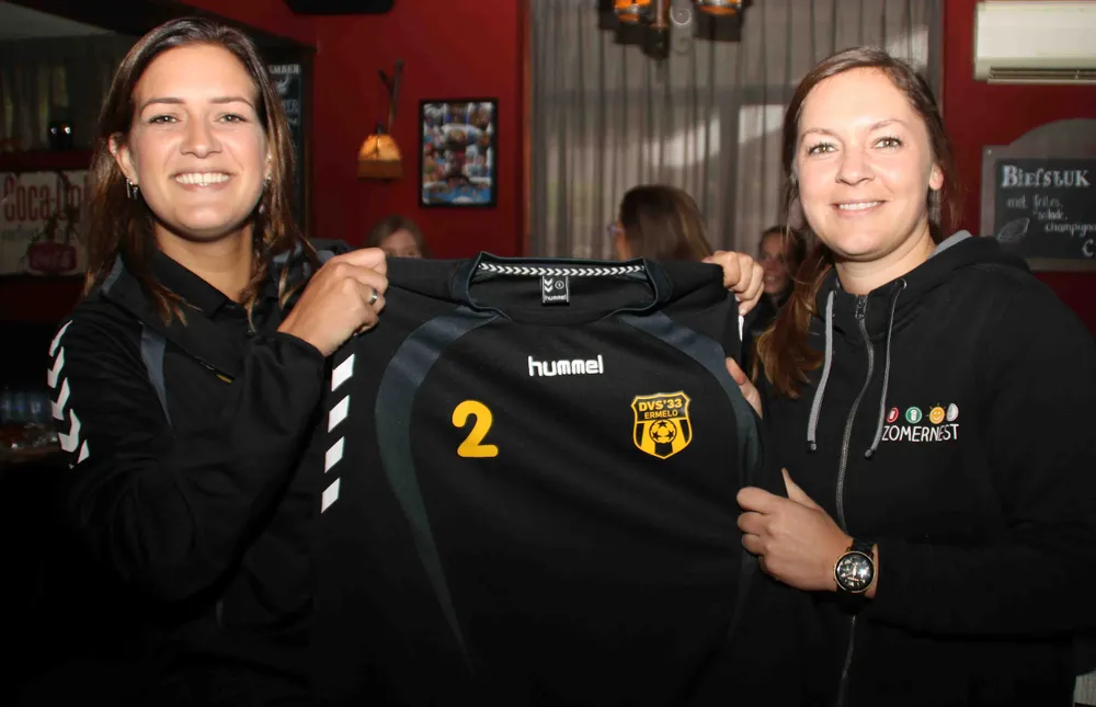 Dames1 van DVS'33 oogst het komend seizoen vast jaloerse blikken van de rivaliserende partijen. Vandaag, zaterdag 9 september, werden aan de 18 spelers namelijk nieuwe inloopshirts uitgereikt die zijn gesponsord door Kristiana Gederte, eigenaar van Bar/Cafetaria/Eetcafé ‘t Zomernest aan de Julianalaan 123 in Ermelo.
