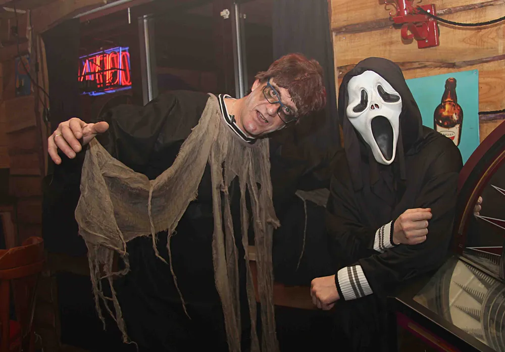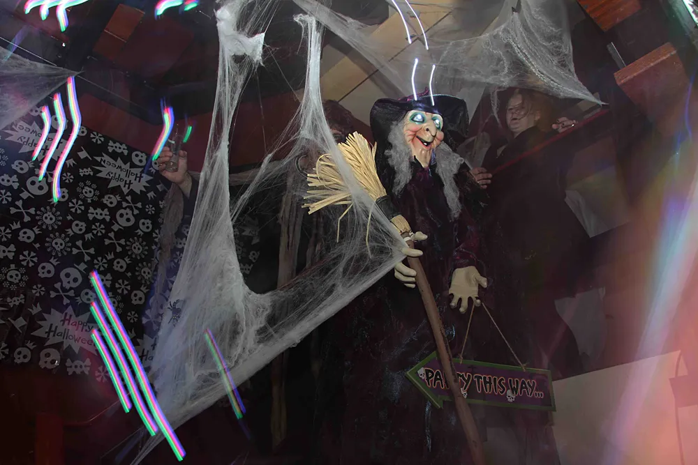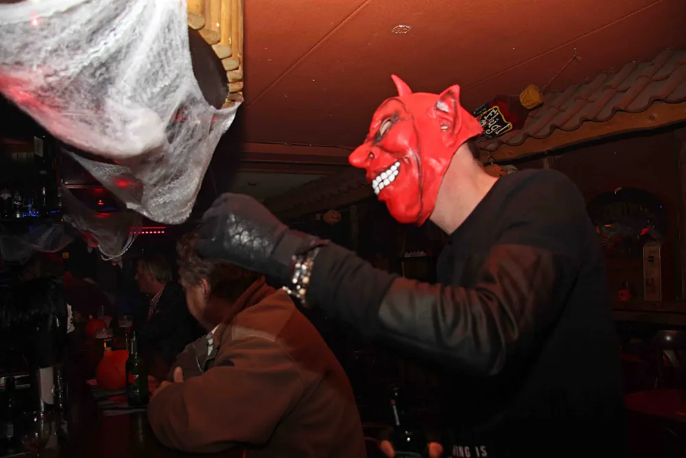 Binnen hing een sinistere sfeerdoor de mistflarden en grote spinnenwebben. Nietsvermoedende gasten zetten het op een krijsen zodra ze oog in oog stonden met de bloeddorstige spinnen. Vaag vielen figuren aan de sta-tafels en de bar te onderscheiden. Zodra je ze scherper in je vizier had zou je het liefst luid gillend rechtsomkeert willen maken, zo angstaanjagend griezelig oogde het gezelschap.