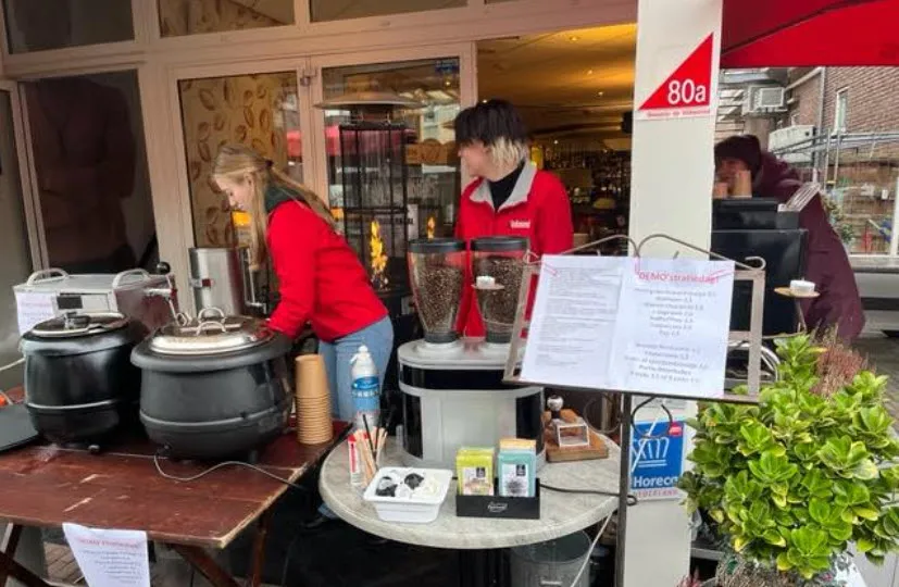 Ruud Post van Brasserie de Volksmond zei al elke dag open te zijn, met uitzondering van de zondag, maar dan voor afhaal. Speciaal voor de ‘DEMO-stratiedag’ had hij een speciaal buffet samengesteld en picknicktafels klaargezet. Binnen een versnapering halen was geen optie. Hij grijnsde: "Geen ruimte, want de tent die normaal buiten staat ligt nu binnen."