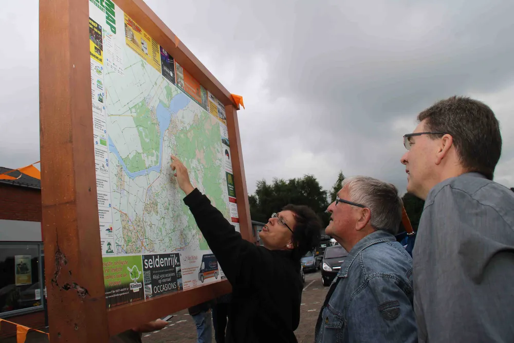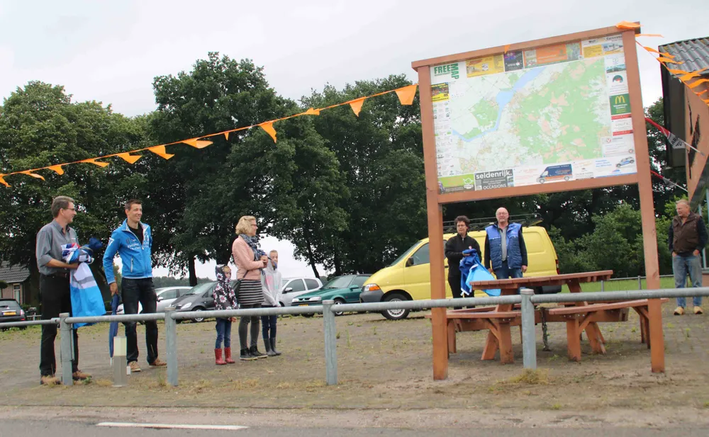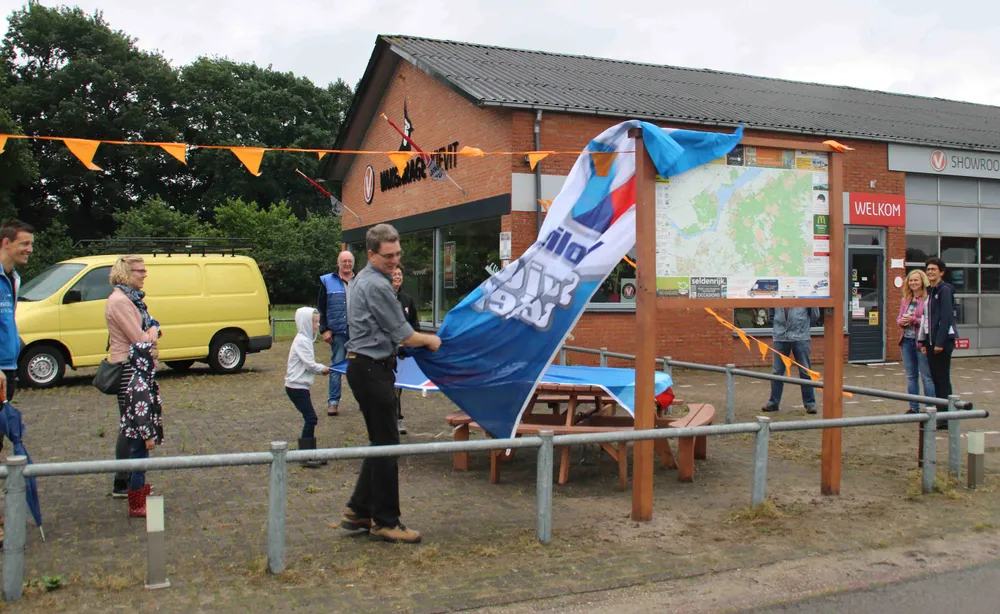 Hoewel de zon het liet afweten en de onthulling tussen de buien door plaatsvond, zullen er genoeg zonnige dagen komen om gebruik te maken van het rustpunt op de dam van het bedrijf van Martina en Hilda Kievit aan de Telgterweg 261A. Temeer omdat een plattegrond van Freemap met knooppunten voor fietsers er prominent is bijgeplaatst.