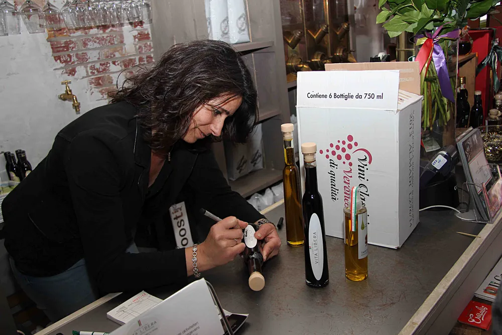Binnen liet sommelier Piet Dooijewaardmet een proeverij liefhebbers kennismaken met verschillende Italiaanse wijnen uit het assortiment van Vita Libera. Eigenaar Linda van den Berg vulde ondertussen een paar rank vormgegeven flesje met balsamico voor een klant die het iemand cadeau wilde geven. "Net als de balsamico verkopen wij ook olijfolie van de tap." De twee jaar zijn voor Linda voorbij gevlogen, zo zeer is het ondernemerschap haar op het lijf geschreven.