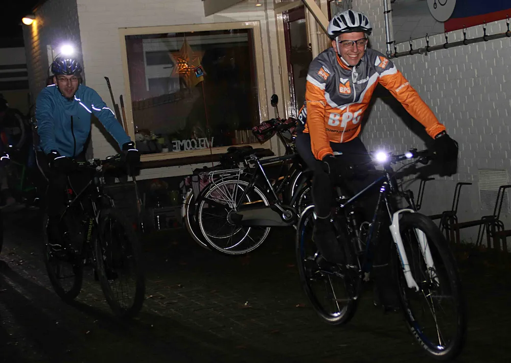 Vanavond, vrijdag 2 december, stipt om half acht is vanaf Vliek Tweewielers aan de Groeneweg 17 een grote groep mannen en een vrouw vertrokken voor een spectaculaire mountainbiketocht van 28 kilometer in het donker. Doel is om de verlichtingssets van BBB uit te proberen.