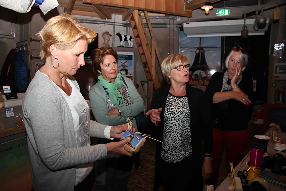 De workshop startte met een rondgang door de Molenwinkelwaar reeds ingepakte pakketjes lonken naar de klanten. Henny en Christine tipten de vrijwilligers hoe ze met eenvoudige veranderingen de producten nog fraaier in kunnen pakken. Met iets meer sjeu maar verfijnd, zo onthulden de dames hun geheim. Een cadeau in doorzichtige folie verpakt met teveel lint en franje leidt de aandacht af van de prachtige spullen. Een lint uit elkaar trekken en pluizen geeft net weer dat extra's aan het pakketje. En waarom geen reclamefoldertje, donateurskaart of beschrijving van het product mee inpakken, wat ook nog meer stevigheid creëert.