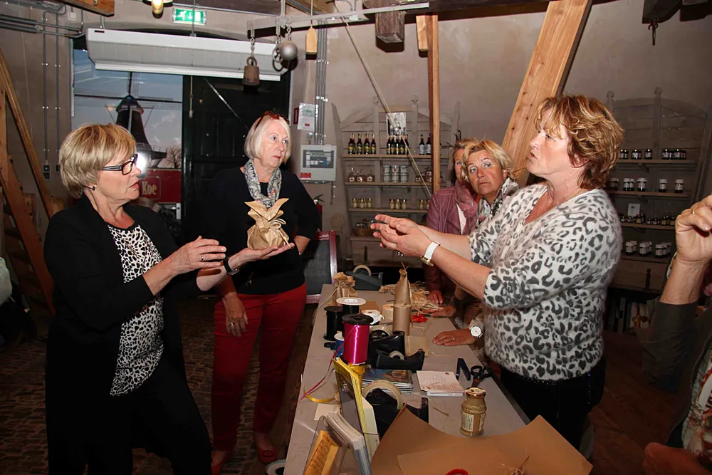Gisteravond, dinsdag 26 mei, gaven ze een workshop producten inpakken in de Molenwinkelaan 9 vrijwilligers van Molen de Koe. Aan vrijwilligerswerk voor Molen de Koe komen de twee dames niet echt toe, gezien hun drukke werkzaamheden in de drogist. Maar hun kennis en ervaring op vrijwillige basis delen doen ze graag. Henny leerde het inpakken samen met haar man Jaap bij tante Ger Marcus van Slooten aan de keukentafel, de periode voor ze de drogist die destijds aan de Kerklaan huisde overnamen.