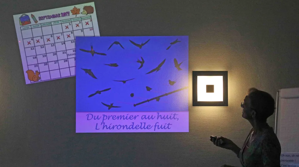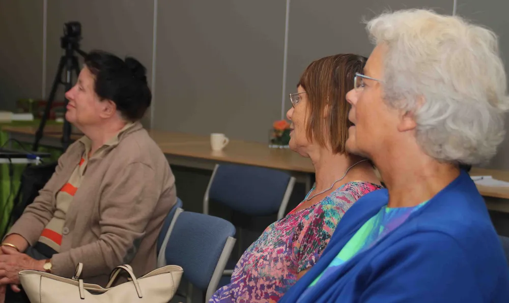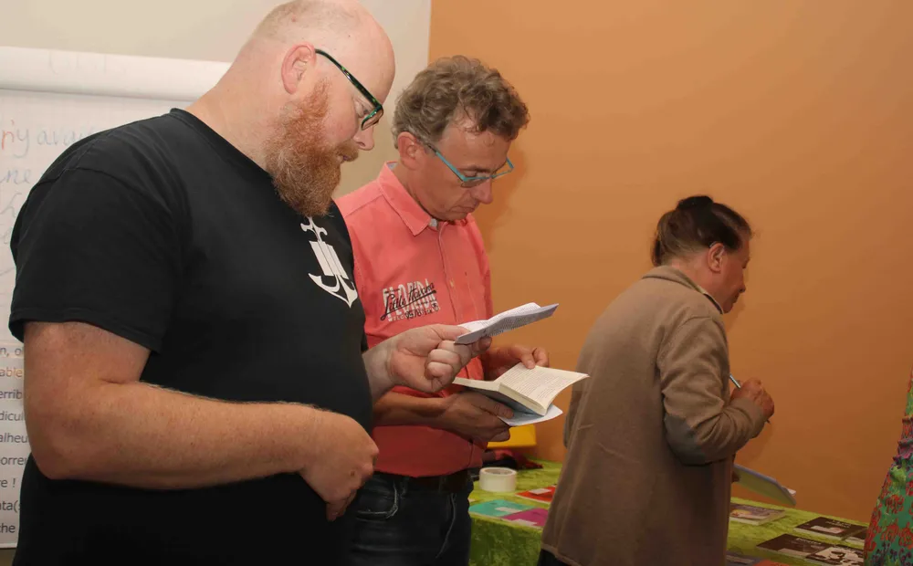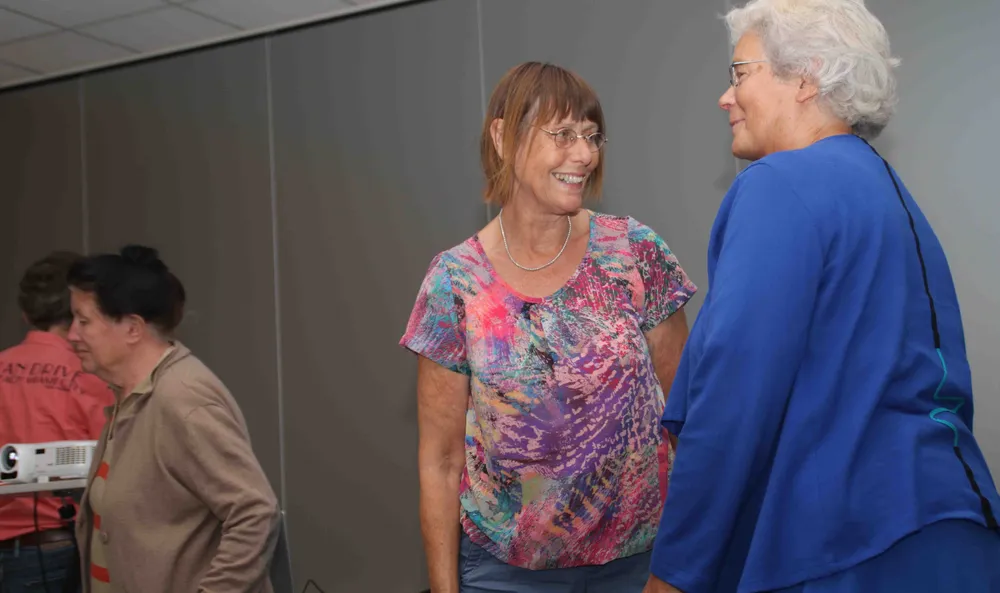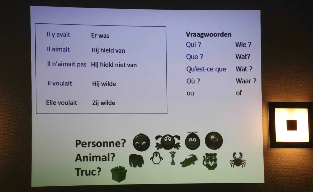 Met een oefening liet Alike zien dat een taal leren ook een kwestie van doen is. Terwijl zij in het Frans de belangstellenden in het Frans vroeg iets te doen: opstaan, zitten, rondlopen, voegde ze ook meteen de daad bij het woord. Meteen met het verzoek haar na te doen. Al vrij vlot kon Alike blijven zitten en wist haar publiek 'de opdrachten' uit te voeren zonder dat ze deze nog voor moest doen.