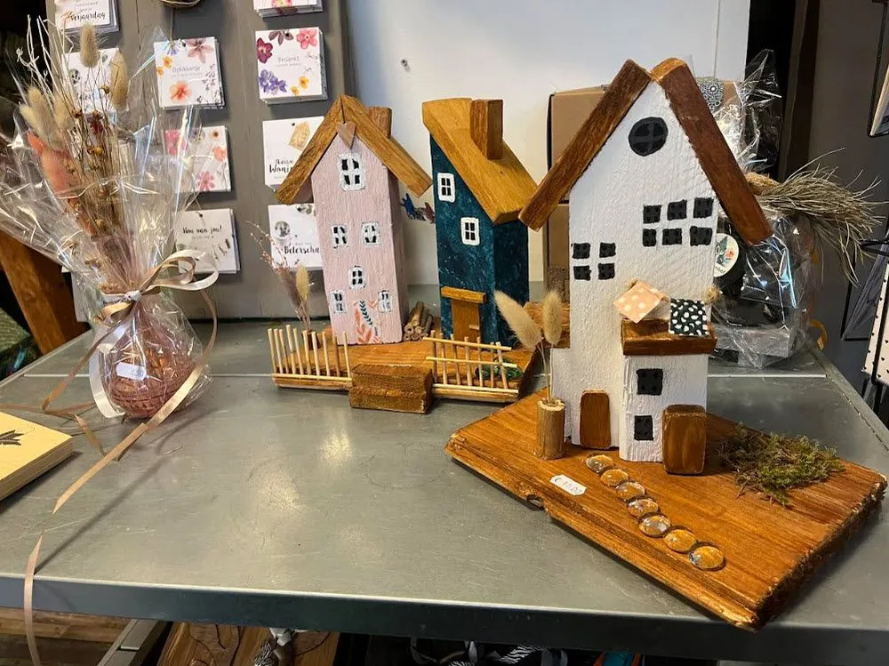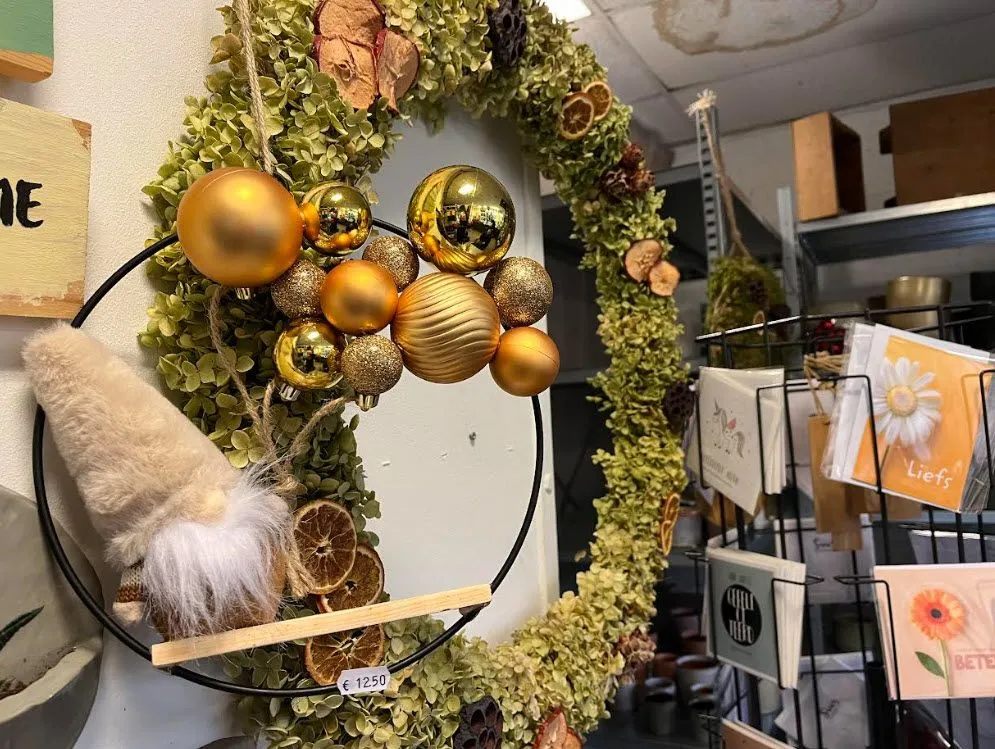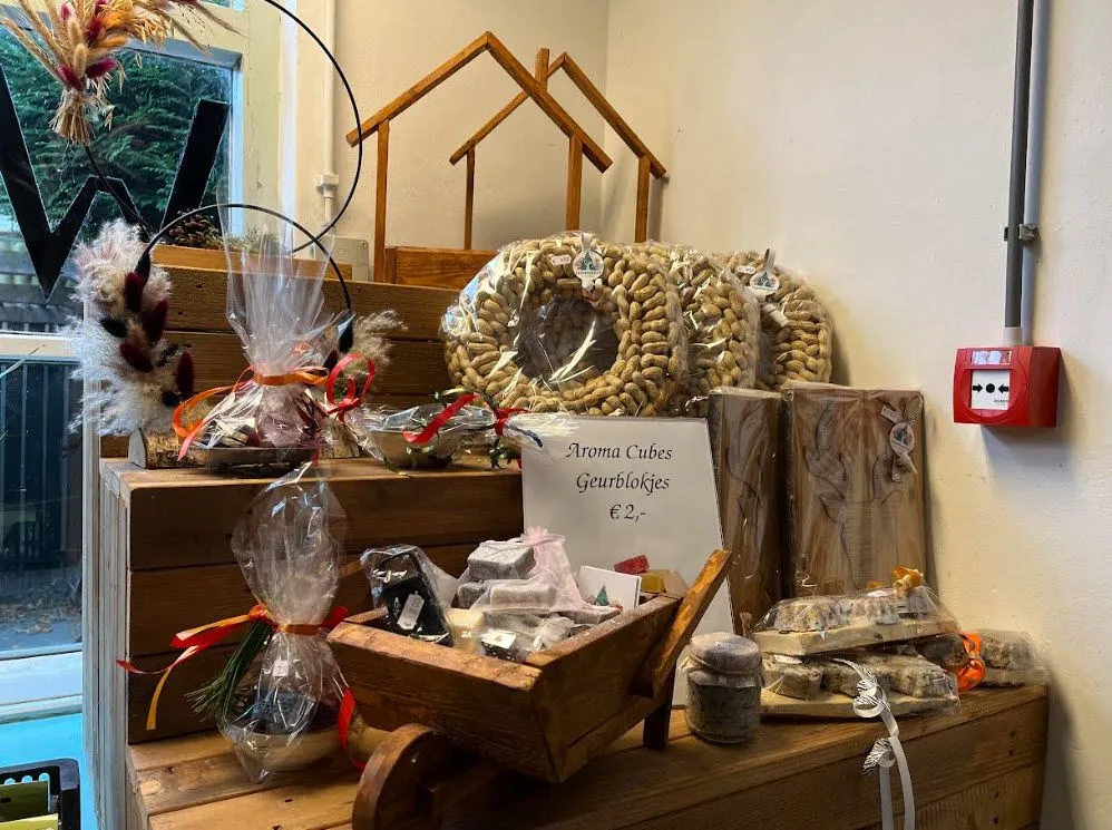 Zo is het elke keer weer verrassend wat de binnen- en buitenwinkel aan leuke cadeaus heeft te bieden. Inmiddels hangt er een gemoedelijke kerstsfeer door het assortiment van artikelen van de groothandel en die zelf zijn gemaakt door de cliënt-medewerkers. Bijzonder kunstig zijn bijvoorbeeld de ringdecoraties die Kiki heeft gemaakt. Ook helemaal in de sfeer van deze tijd zijn de zelfgemaakte voederhuizen voor vogels, pindakransen, vetpothouders tot pindaslingers.